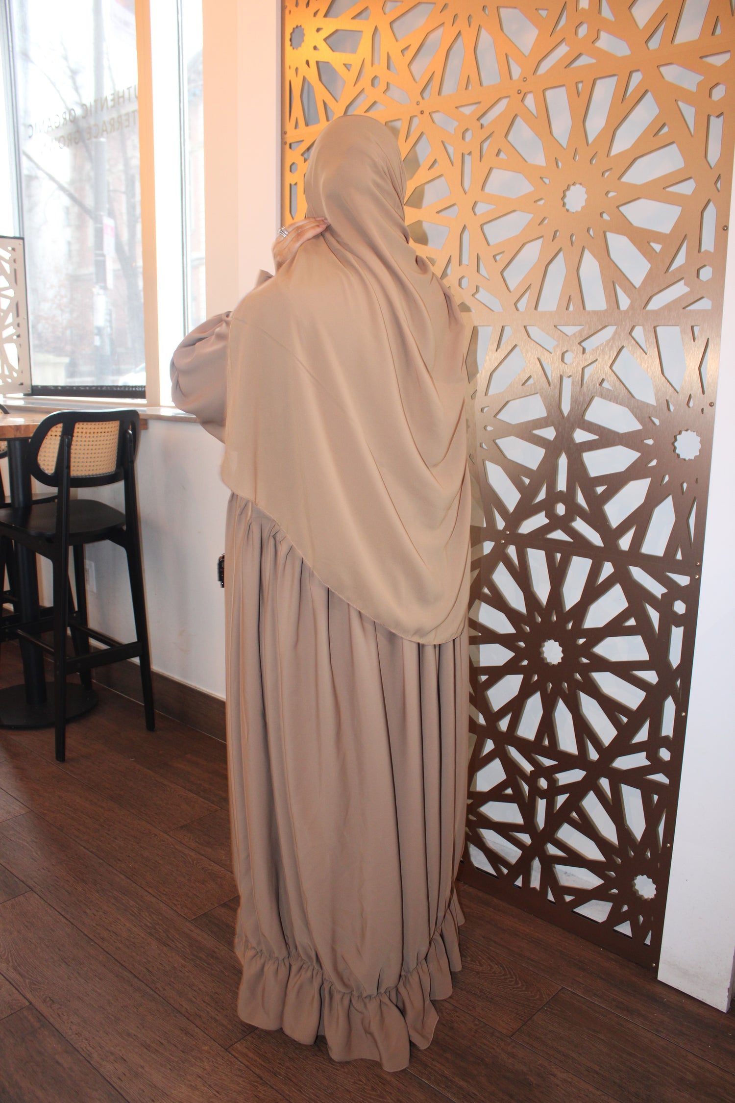 Designed with refined details, this piece features elegant tie sleeves paired with gathered ruffle accents at the waist and hem for a polished, feminine silhouette.